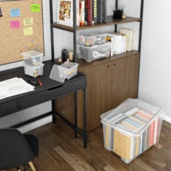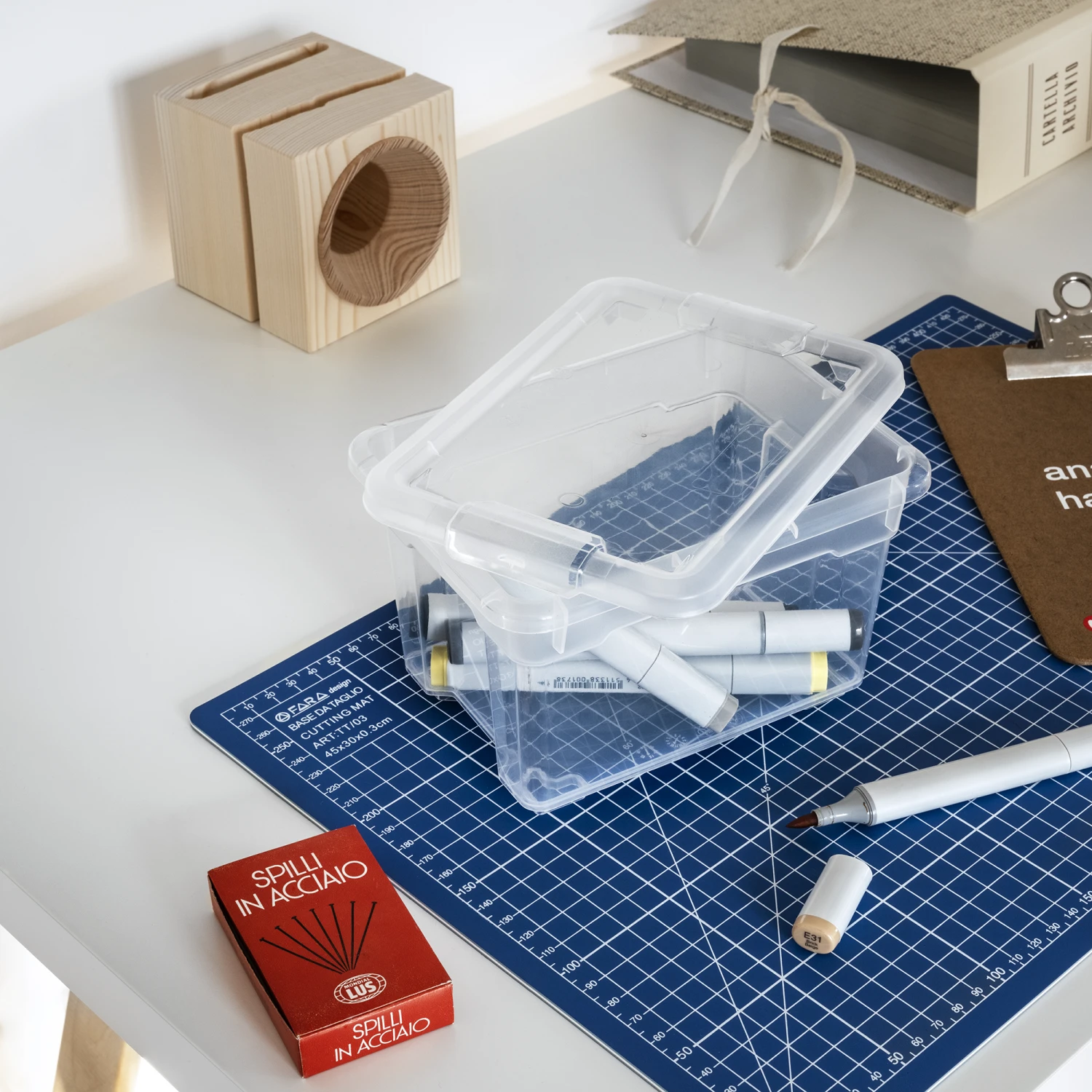 Multifunktionale Aufbewahrungsbox aus transparentem Kunststoff, mit Deckel.