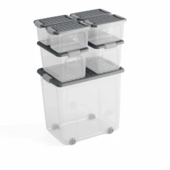 Multifunktionale Aufbewahrungsbox aus transparentem Kunststoff, mit Deckel.