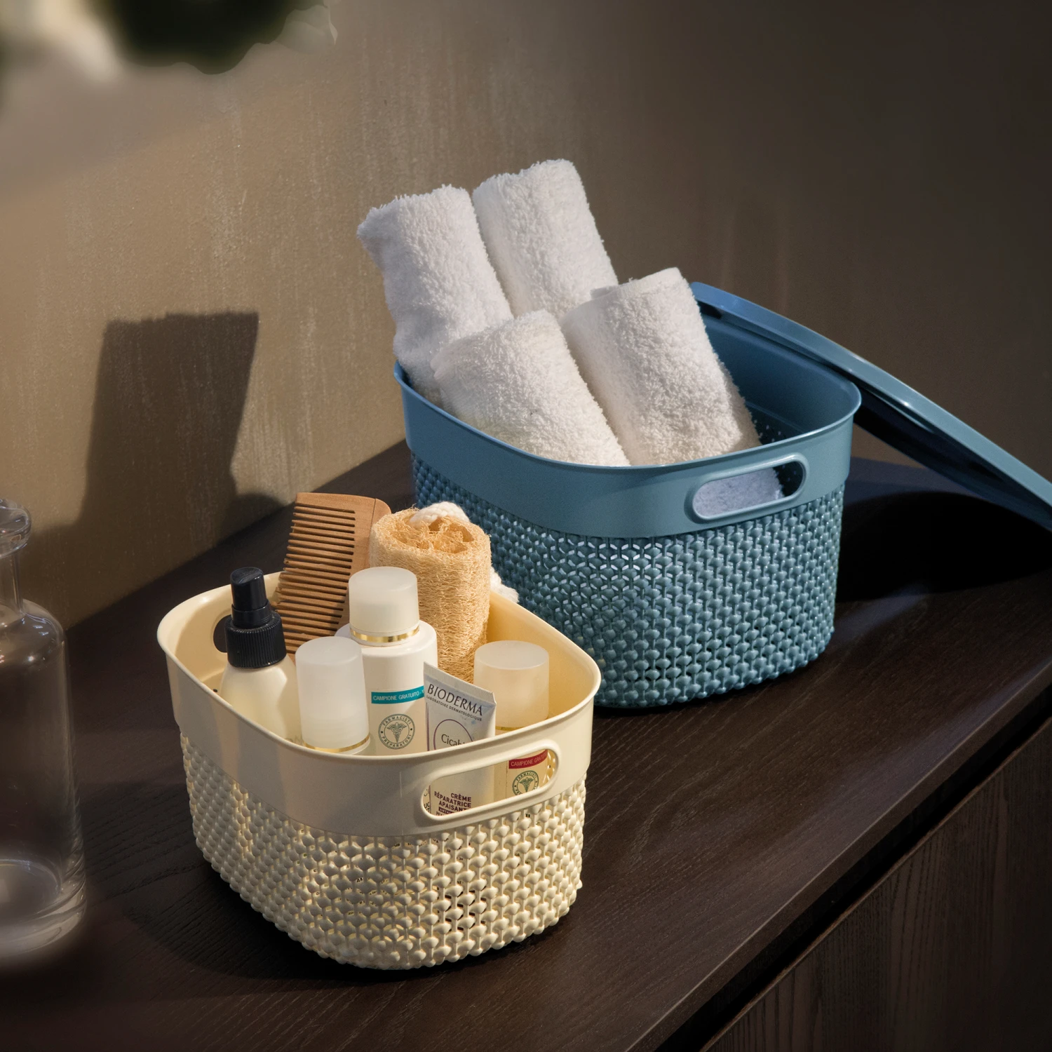 Der dekorative Aufbewahrungskorb ‚Filo‘ ist mit bequemen Tragegriffen ausgestattet. Er ist ineinander stapelbar und eignet sicht gut für die Aufbewahrung in Wohnzimmern, Schlafzimmern, Badezimmern und Büros.