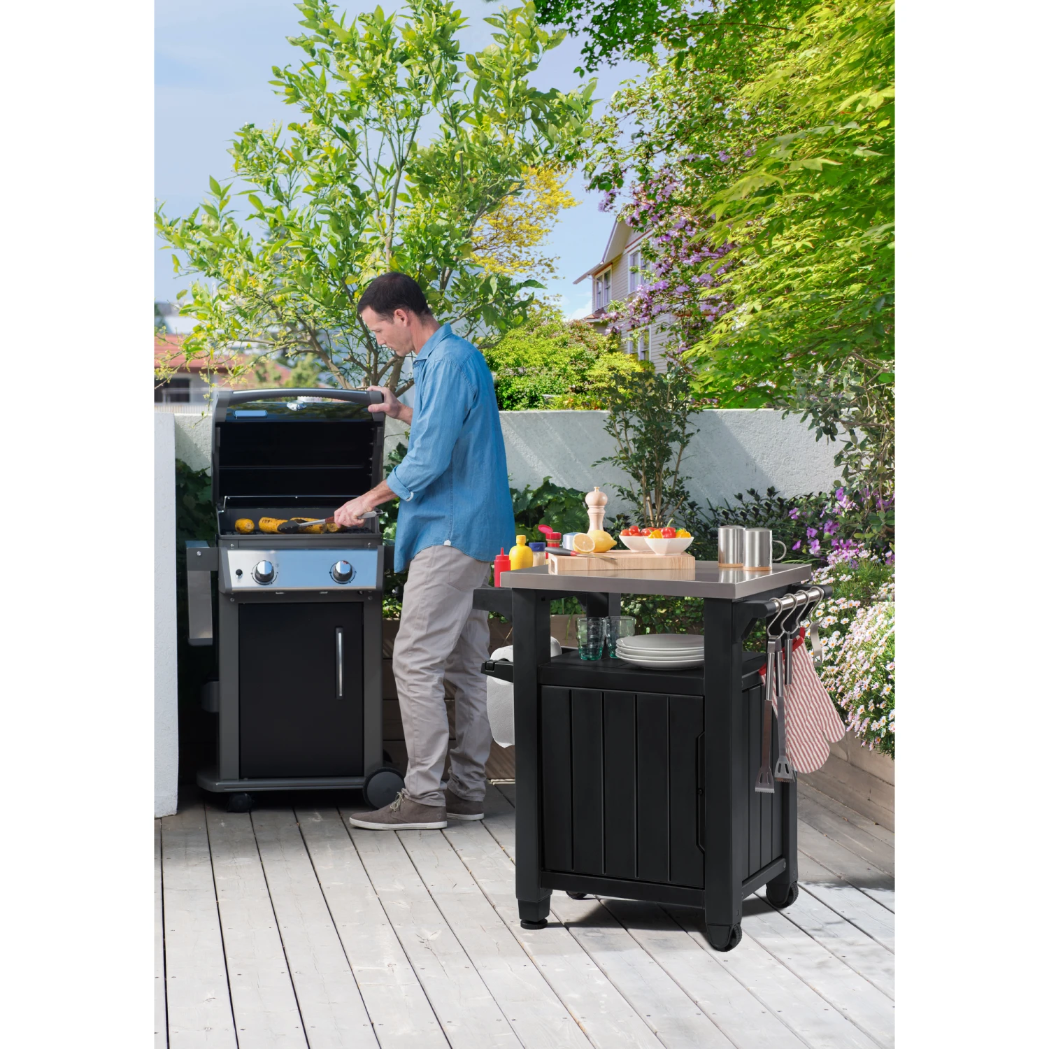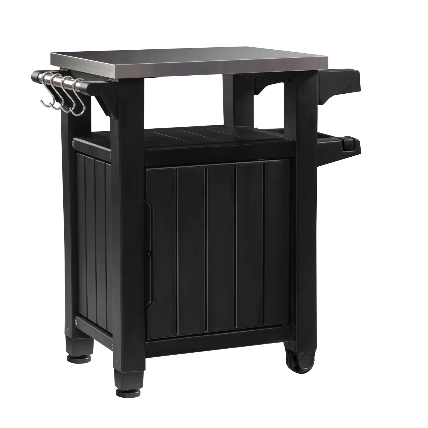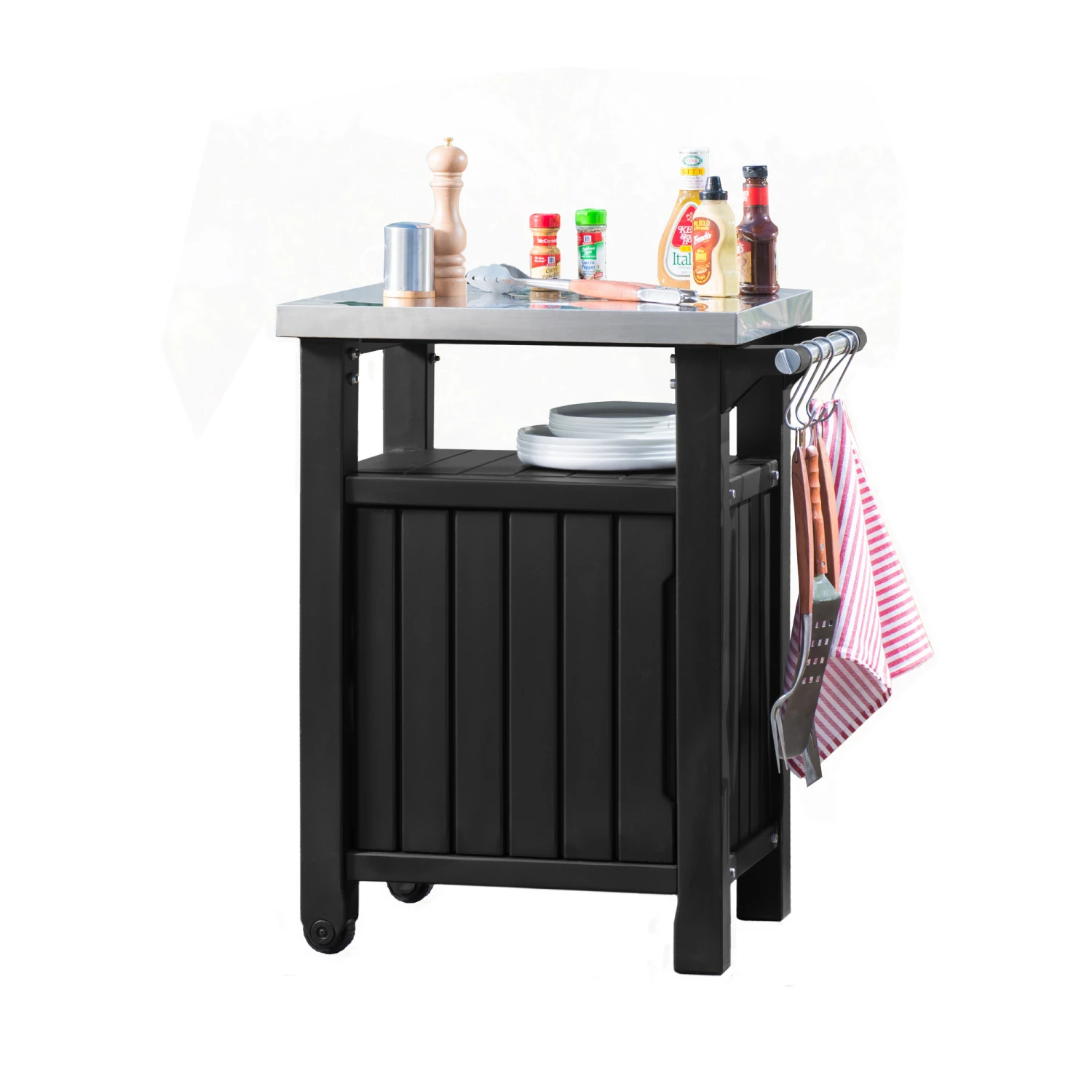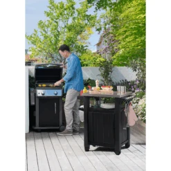 Der multifunktionale BBQ-Beistelltisch bietet einen geschlossenen Stauraum von ca. 93 Liter. Neben einem KĂŒchenrollen-Halter, einem GewĂŒrzregal und einer TĂŒr zeichnet sich der Tisch durch eine hochwertige Edelstahl-Platte aus und bietet viel Platz beim Zubereiten und Servieren von Speisen und GetrĂ€nken. Er ist die perfekte ErgĂ€nzung beim Grillen und dank seines witterungsbestĂ€ndigen Materials ideal fĂŒr den Garten oder den Balkon geeignet. Durch seine zwei Rollen kann der Tisch problemlos bewegt werden.
