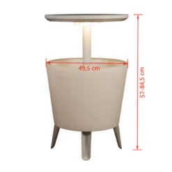 Die Eiskübel-Basis verfügt über doppelwandige Isolierung, um Getränke kalt zu halten und ist auch mit einem Drainage-Stecker ausgestattet, um das Entleeren des Kübels nach Gebrauch zu erleichtern. Ein einfaches Dreh- und Verriegelungssystem hält die Tischplatte stabil, wenn sie höhenverstellt wird. Wenn die Tischplatte in der untersten Position ist, ist der Tisch auch für den Einsatz als Couchtisch geeignet.