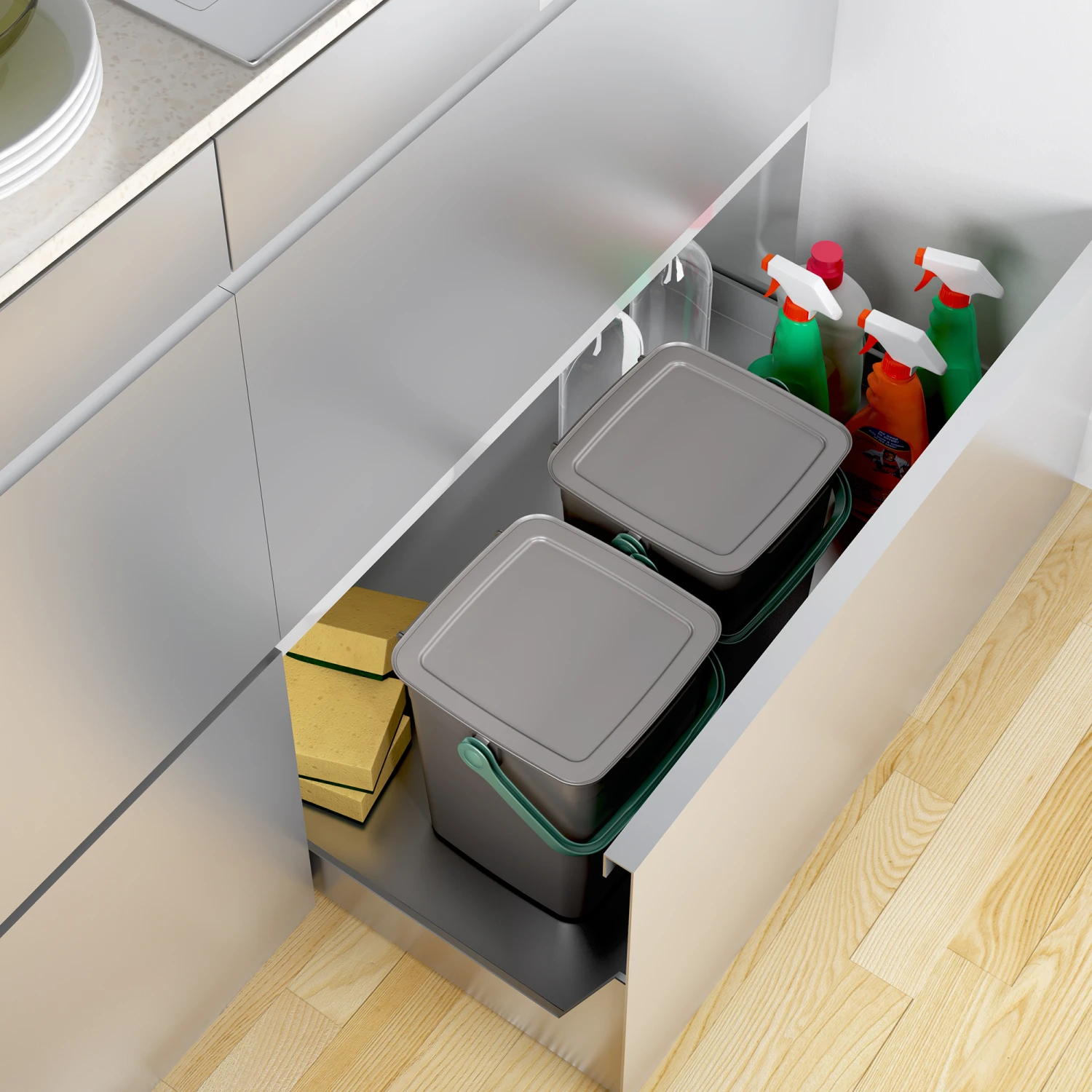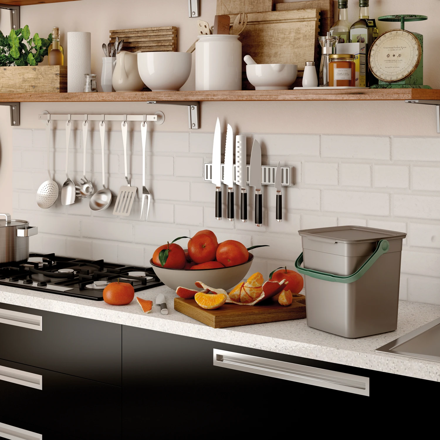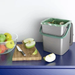 Der kompakte Bio-Kompost Eimer ‚Smart‘ umfasst viele praktische Details. Der robuste, ergonomische Griff dient unter anderem als Sicherheitssperrvorrichtung. Legt man den Tragegriff nach vorne, ist der Klappdeckel sicher und einfach verschlossen. AuĂerdem erleichtert der Smart Bio Container das Entleeren durch einen versteckten Griff auf der Unterseite. Er ist vielseitig einsetzbar und passt mit seinem modernen Design in jede Umgebung.