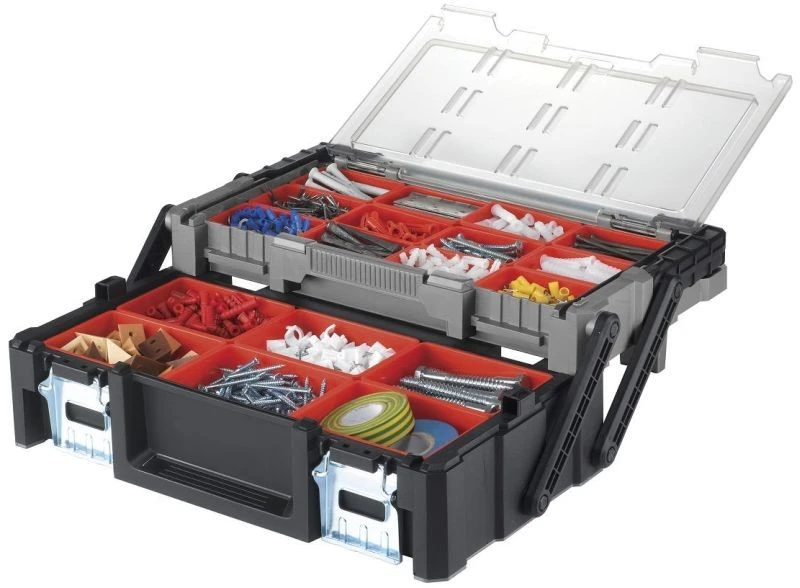 Mit der Werkzeugkiste CANTILEVER 18″ von Keter haben Sie Ihre Werkzeuge und Schrauben ordentlich und übersichtlich auf 2 Ebenen gelagert und immer sofort griffbereit! Dies erspart Ihnen mühsames Suchen und das Tragen verschiedenster Kisten. Dieser schicke Sortierkasten ist nicht nur für Heimwerker geeignet!