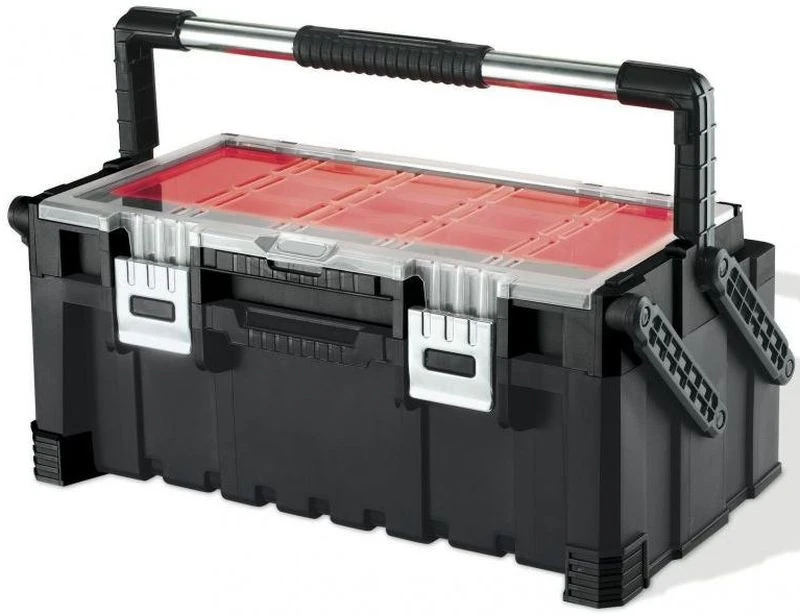 Alles an seinem Platz und alles auf einen Blick finden – mit dem Keter CANTILEVER 22″ Sortimentskoffer mit zwei Etagen kein Problem. Im unteren Bereich lässt sich größeres Werkzeug verwahren, oben im Sortimentsfach mit transparentem Deckel liegen Kleinteile in 9 kleinen (10 x 6 x 5 cm) und 2 großen (17 x 9 x 5 cm) herausnähmbaren Kuststoffschälchen einsatzbereit. Metallschließen und ein stabiler Haltegriff sorgen für einen sicheren Transport.