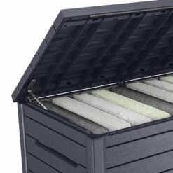 Diese attraktive Garten-Aufbewahrungstruhe verfügt über ein beeindruckendes Fassungsvermögen von 870 Litern und eignet sich somit für sperrige Gegenstände, von großen Kissen und Polster über Gartengeräte bis hin zu Poolzubehör. Der Deckel ist mit praktischen Gasfedern ausgestattet, um das Öffnen und Schließen zu vereinfachen und sicherer zu machen. Die Truhe kann mit einem Vorhängeschloss (nicht inbegriffen) verschlossen werden.