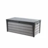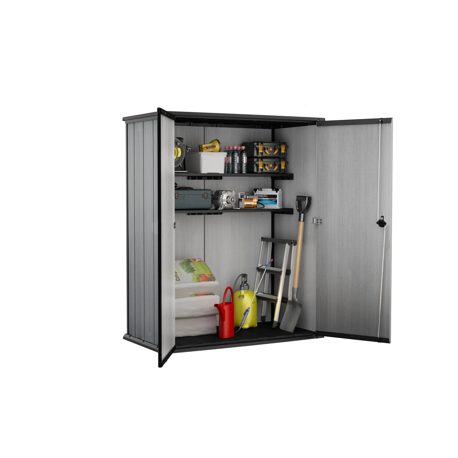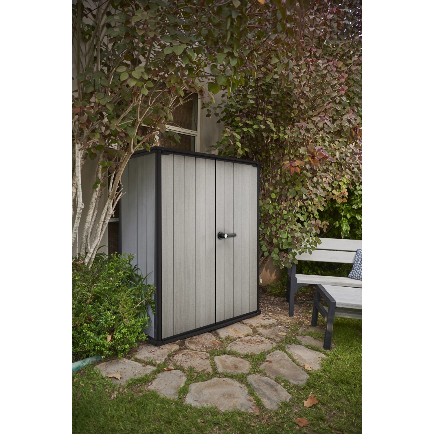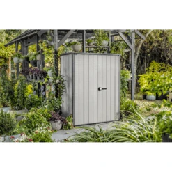 Der Garten-/Aufbewahrungsschrank ‚High Store Plus‘ aus hochwertigem DUOTECHâą Material besticht vor allem durch seine natĂŒrliche, raue Holzoptik. Das speziell entwickelte DOUTECHâą Material verbindet Holz-Ăsthetik mit einer hohen BestĂ€ndigkeit vor wetter- und UV-EinflĂŒssen und ist damit nicht nur langlebiger, sondern auch wartungsarmer als ein Naturholzprodukt. Durch das zeitlose Design wird der ‚High Store Plus‘ zum Blickfang in jedem Garten. Wer jedoch den Aufbewahrungsschrank farblich individuell verĂ€ndern möchte, kann es problemlos in seiner Wunschfarbe anstreichen. So bietet es Gestaltungsfreiraum fĂŒr jeden Geschmack. Der Aufbewahrungsschrank mit seinem Nutzinhalt von 1.500 l ist hervorragend zur Aufbewahrung von vielen Gartenutensilien geeignet. Durch zwei groĂe TĂŒren erfolgt ein einfacher Zugang zum gerĂ€umigen Inneren der Box. Die innenliegenden SeitenwĂ€nde sind so konzipiert, dass Holzbretter (diese sind nicht im Lieferumfang enthalten) als Regale integriert werden können, wodurch eine vereinfachte Organisation und Ordnung des Inhalts ermöglicht werden. Nach der einfachen Montage der Nut- und Feder-Paneele ist der Schrank bruchsicher und die hochwertige Verarbeitung ermöglicht eine langlebige Platzierung im AuĂenbereich.