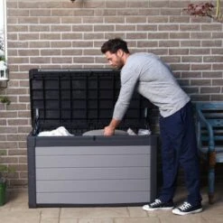 Mit ihrer Holzoptik und ihrem modernen Design ist die Gartentruhe eine tolle Ergänzung zu deinem Garten. Die Premier Kissenbox bietet ein Fassungsvermögen von 380 Litern und eignet sich daher perfekt auch für Auflagen oder Pool-Zubehör. Der Deckel ist mit praktischen Gasdruckfedern ausgestattet, die ein einfaches und sicheres Öffnen und Schließen gewährleisten. Dank der wetterfesten Konstruktion hält die Outdoor-Truhe sowohl Sonne als auch Regen stand und sorgt dafür, dass deine Sachen trocken und gut belüftet aufbewahrt werden.