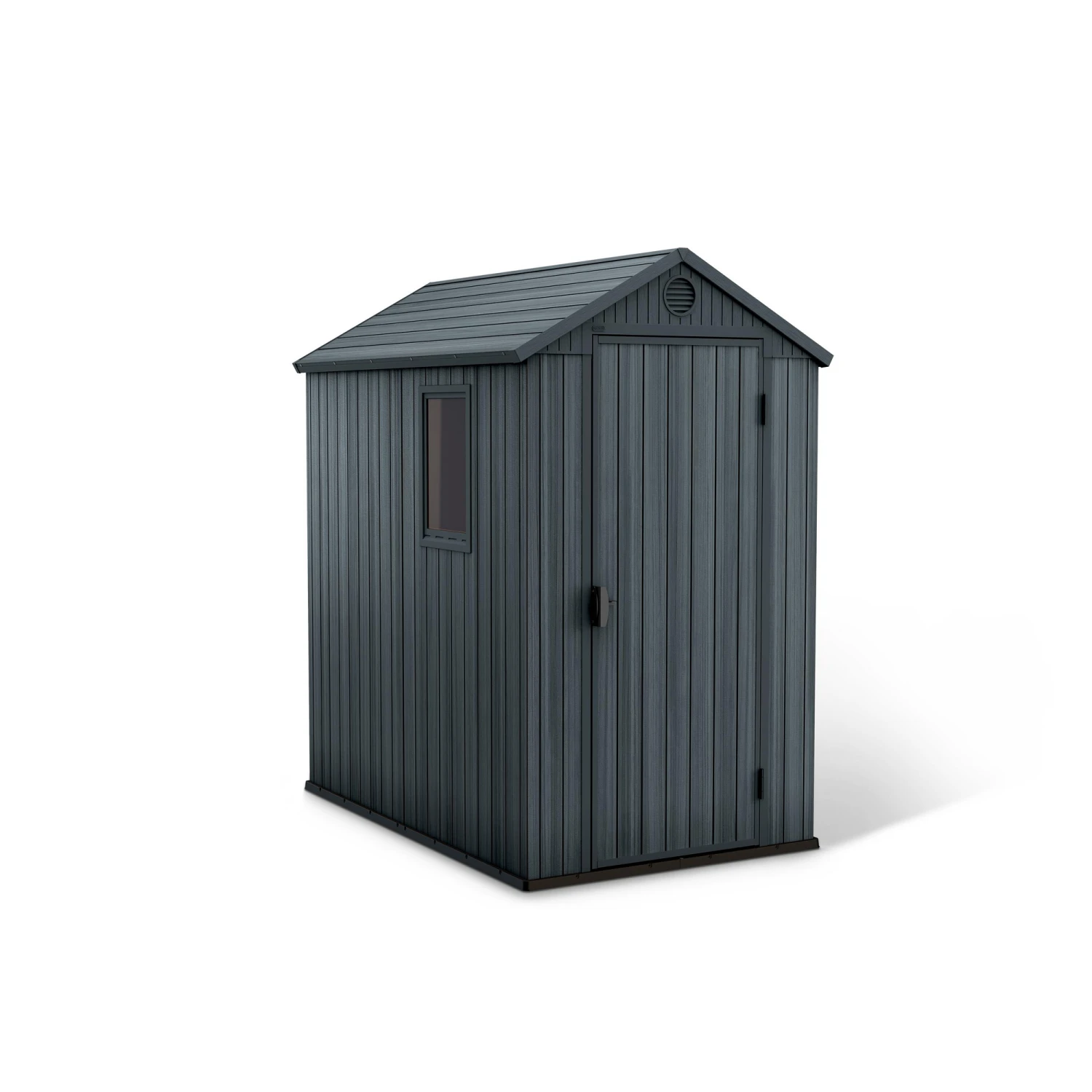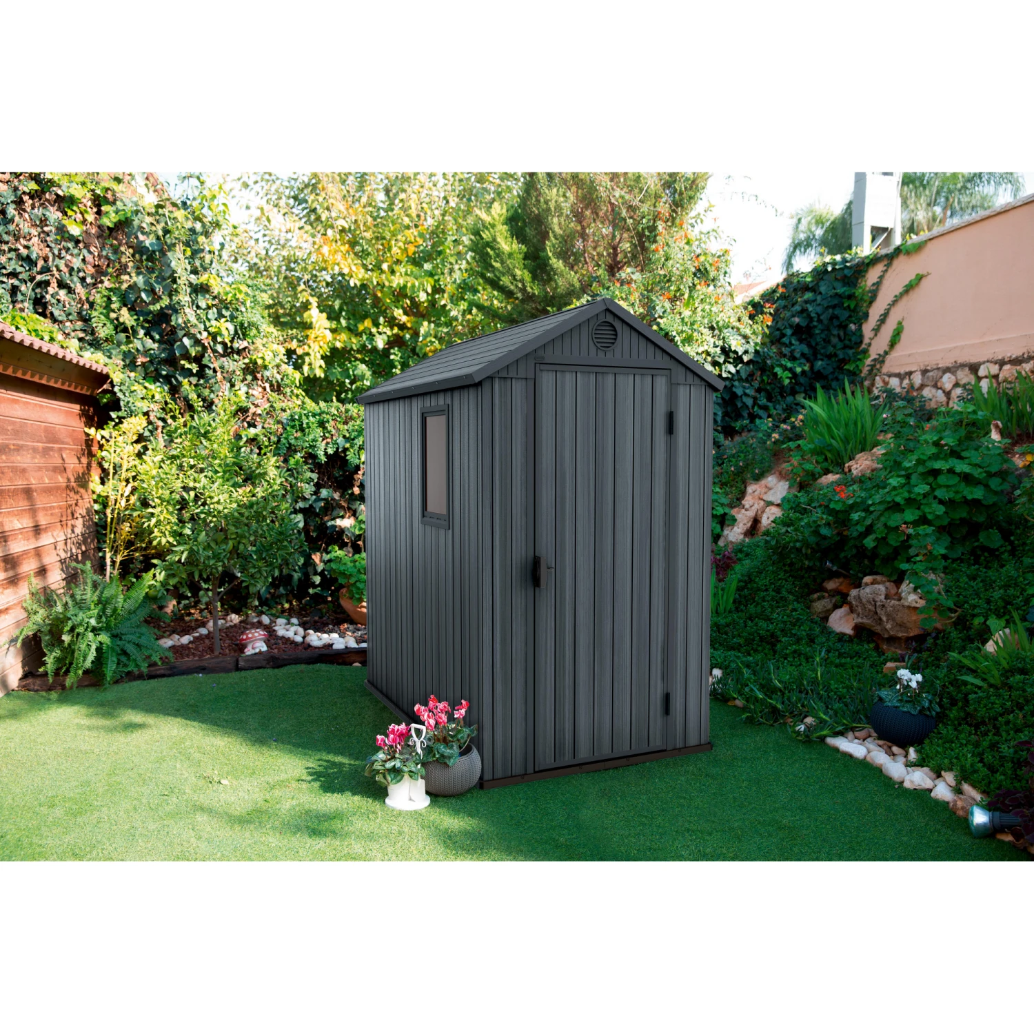 Das GerĂ€tehaus âDarwin 6×4â von der Marke Keter ist aus stabilem Kunststoff in der Farbe Grau/Anthrazit hergestellt. Durch seine natĂŒrlich wirkende, raue Holzoptik erhĂ€lt es einen tollen Look und ist dank seines Materials wetter- und UV-bestĂ€ndig. Die TĂŒr mit TĂŒrriegel ist abschlieĂbar, sodass deine GartengerĂ€te und -werkzeuge vor eventuellen Langfingern geschĂŒtzt sind. Du kannst das GerĂ€tehaus ganz einfach durch Nut und Feder Paneele in deinem Garten montieren.