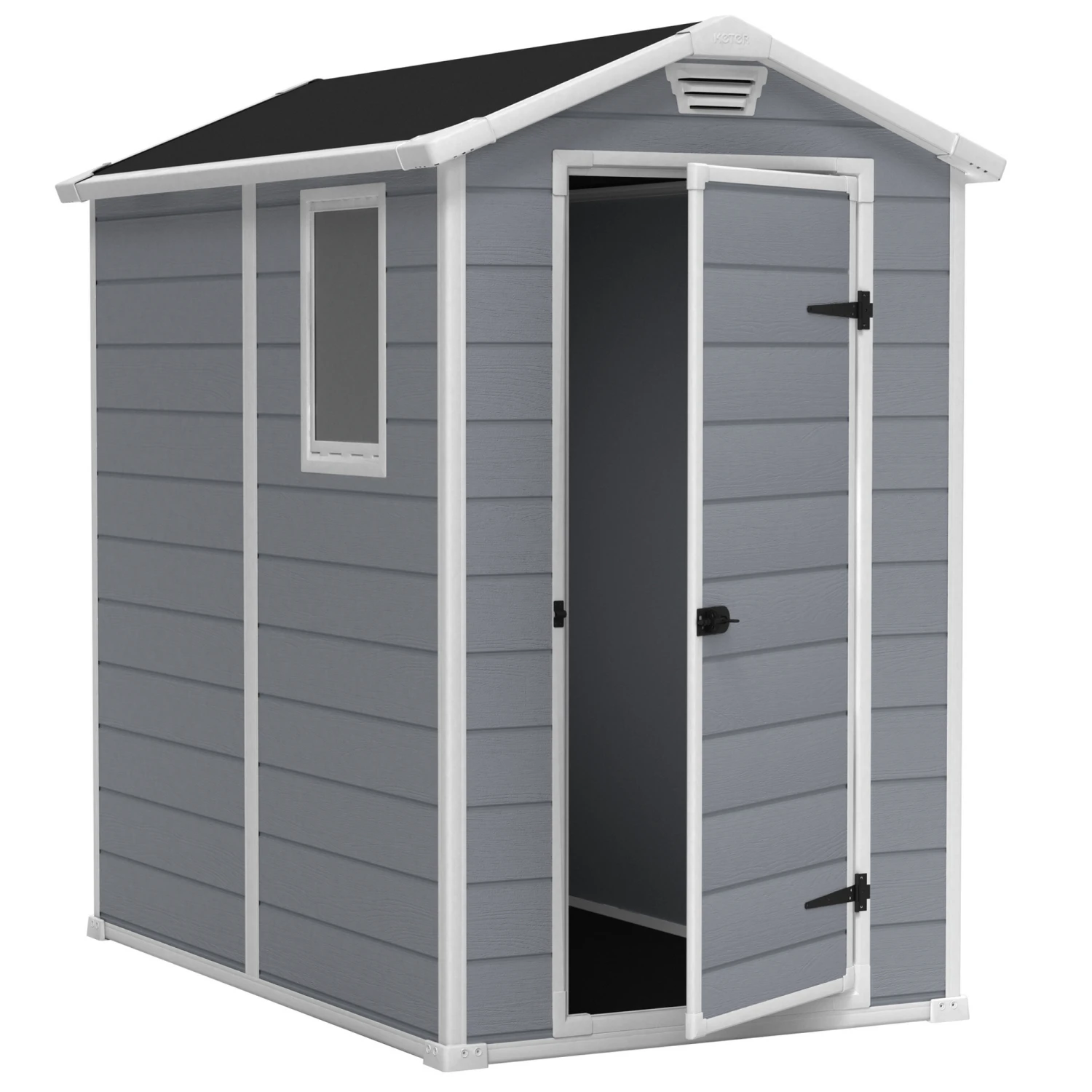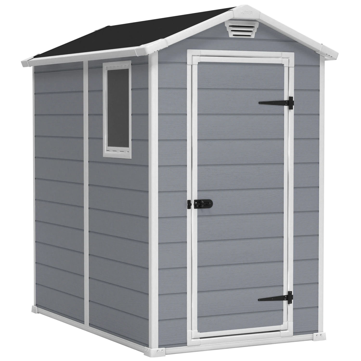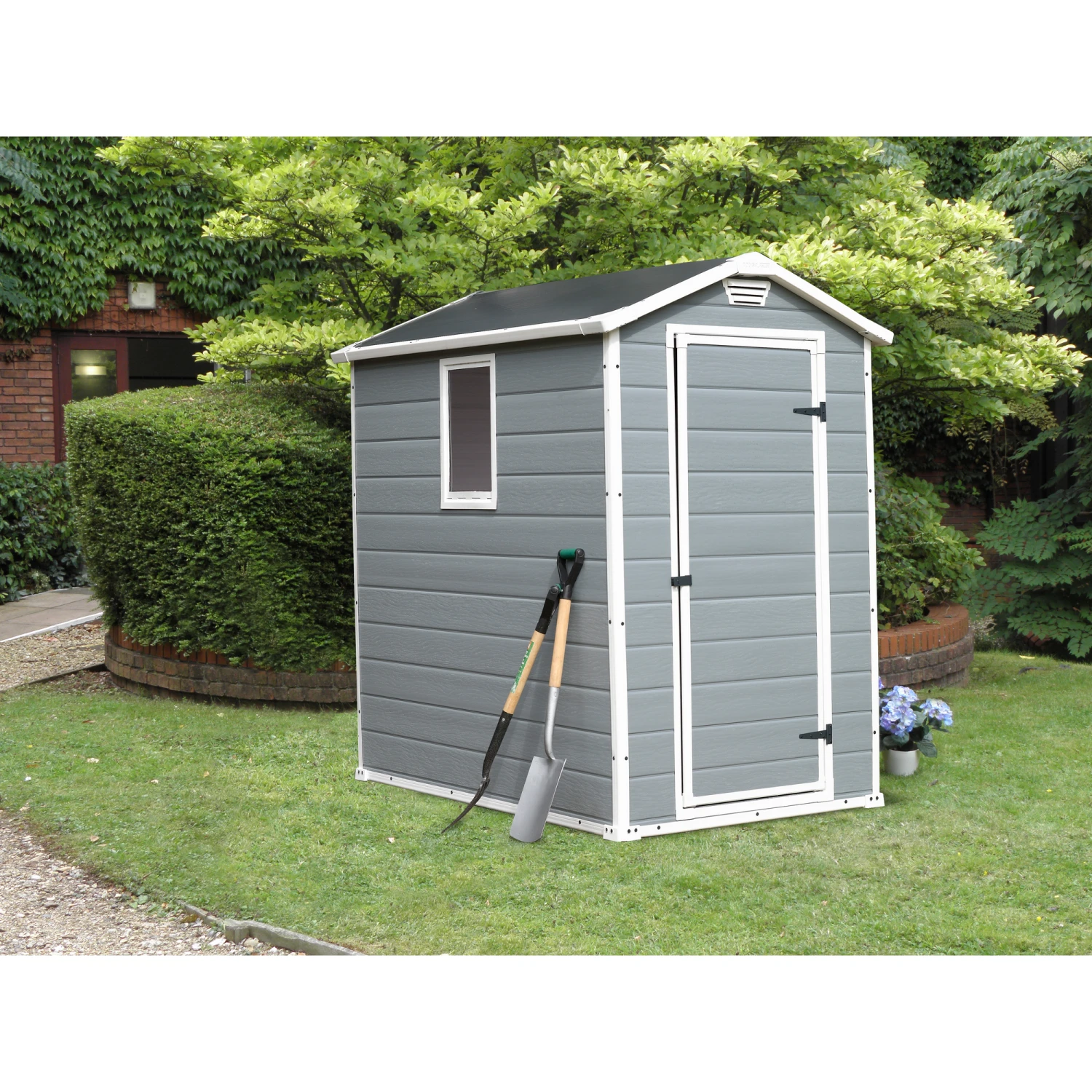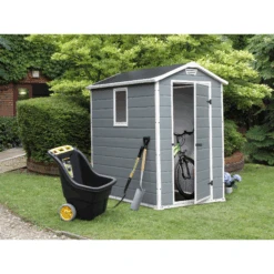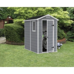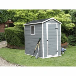 Gemeinsam Zeit im Garten zu verbringen heißt Lebensqualität in aufgeräumter Atmosphäre. Das Manor-Kunststoffgerätehaus bietet eine optimale Stauraum-Möglichkeit, die unseren Stil im Freien prägt. Es wartet auf mit einer geräumigen Fläche, um alle Gartenutensilien vor Wind und Regen zu schützen. Dennoch nimmt es durch seine kompakte Größe nicht zu viel Platz im Freien ein. Mit dem klassischen Design und der extremen Stabilität ist es die perfekte Aufbewahrungslösung. Sowohl die große Tür als auch das Fenster unterstreichen den praktischen und zweckdienlichen Charakter. Die besonderen Eigenschaften des Kunststoffmaterials des Hauses verschaffen langjährige Begeisterung ohne jeglichen weiteren Arbeitsaufwand. Somit eine komfortable Lagerlösung, die sich wunderbar in den Garten integriert. Das Haus lässt sich zudem auch abschließen (Schloss nicht im Lieferumfang enthalten).