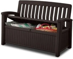Eine formschöne Gartenbank und eine Aufbewahrungsbox PATIO BENCH in naturgetreuer Holzoptik. Diese Bank/Box bietet bequem Platz für 2 Personen und kann gleichzeitig Auflagen und Gartenzubehör etc. verstauen, der Inhalt bleibt stets trocken und wird belüftet. Das Material ist UV-beständig, langlebig und für den Einsatz im Freien bestens geeignet.