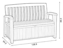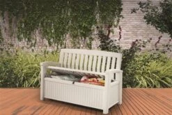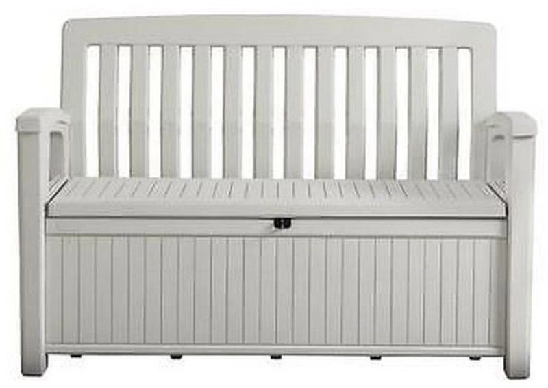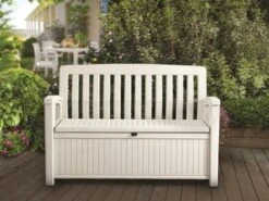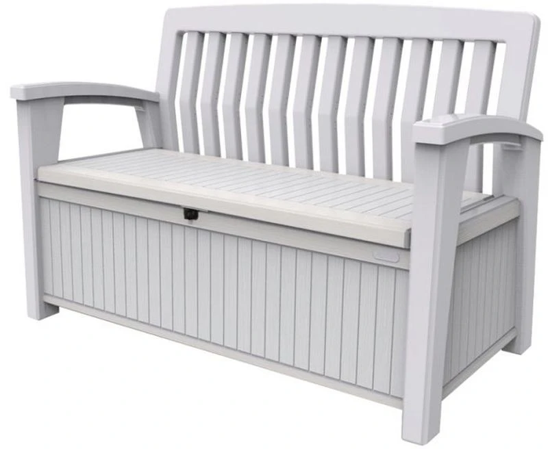 Eine formschöne Gartenbank und eine Aufbewahrungsbox PATIO BENCH in naturgetreuer Holzoptik. Diese Bank/Box bietet bequem Platz für 2 Personen und kann gleichzeitig Auflagen und Gartenzubehör etc. verstauen, der Inhalt bleibt stets trocken und wird belüftet. Das Material ist UV-beständig, langlebig und für den Einsatz im Freien bestens geeignet.