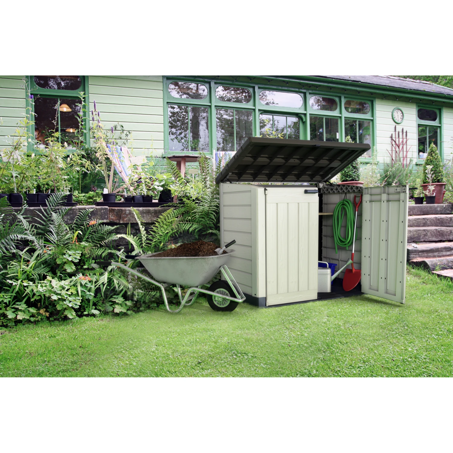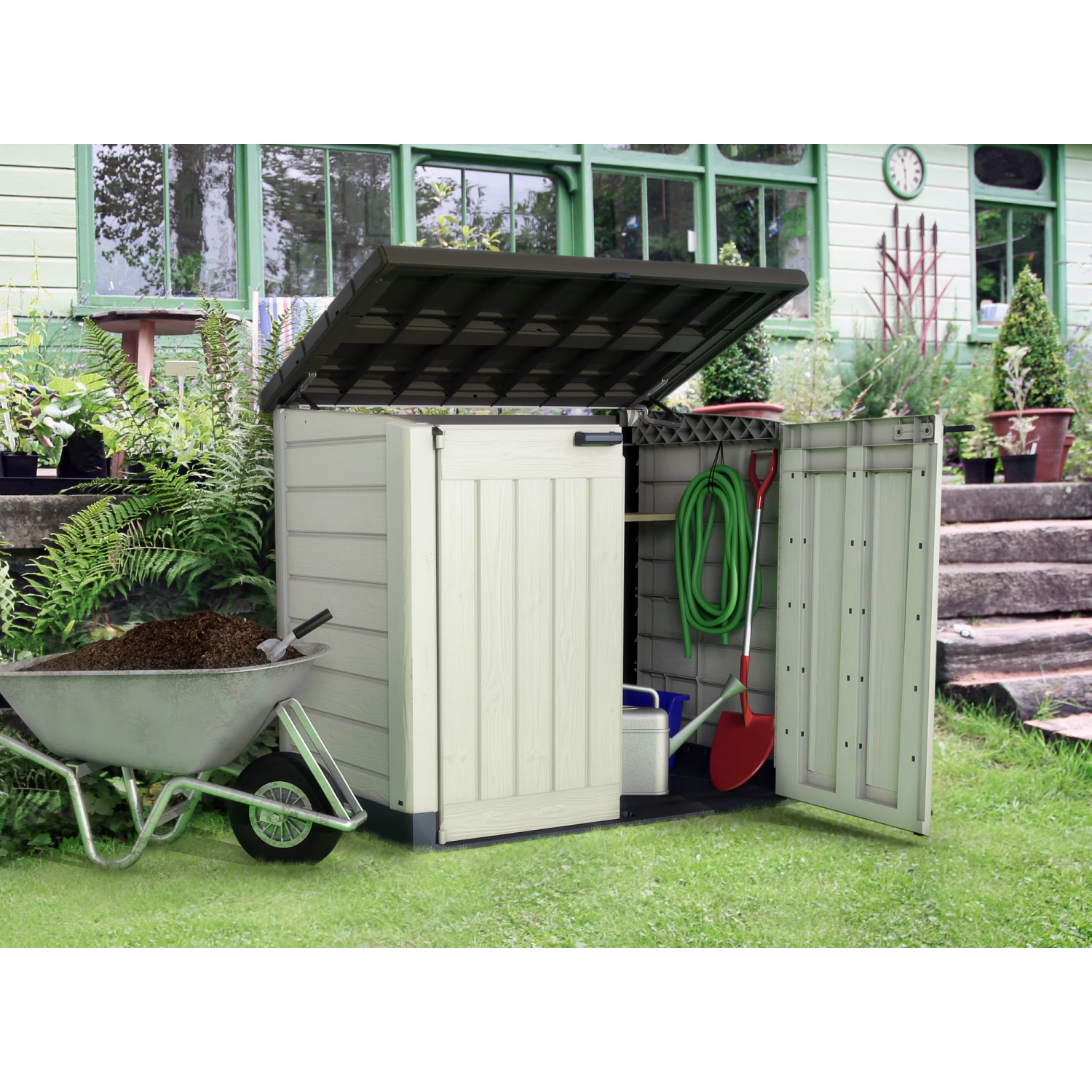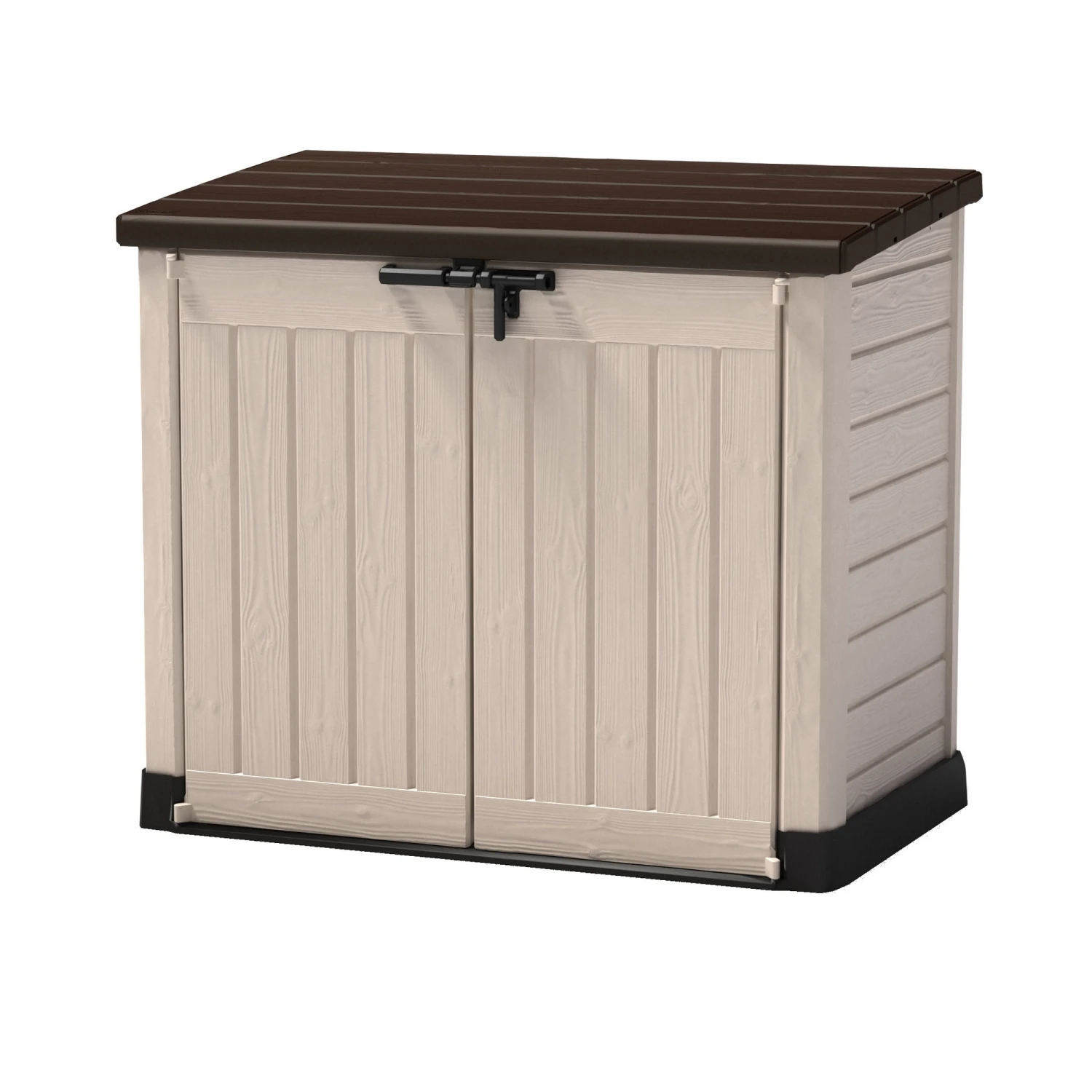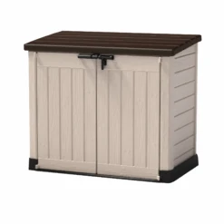 Die vielseitige Aufbewahrungsbox in Holzoptik fĂĽr jeden Garten. Die ‚Store It Out Max‘ ist ideal zum Verstauen von Gartengeräten, Gartenmöbeln, oder auch deinem Grill. Sie bietet alternativ auch Platz fĂĽr zwei Abfalltonnen bis zu 240 l Inhalt. Zwei groĂźzĂĽgige TĂĽren und ein aufklappbarer Deckel mit integrierten Gasdruckfedern sorgen fĂĽr einfaches Verstauen Ihrer Gegenstände. Die innenliegenden Seitenwände sind so konzipiert, dass ein Holzbrett (dieses ist nicht im Lieferumfang enthalten) als Regal integriert werden kann, wodurch dir noch mehr Stauraum auch fĂĽr kleine Dinge zur VerfĂĽgung steht.
