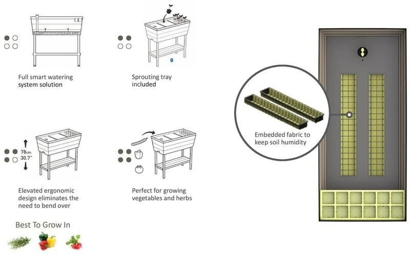 Die Blumenkasten Urban Bloomer mit integriertem Bewässerungssystem macht die Pflanzenzucht viel einfacher. Die Wasserstandsanzeige verhindert eine Überwässerung. Die kleinen Behälter erleichtern die Organisation der Setzlinge. Ein weiterer Vorteil ist das Regal, auf dem das notwendige Gartenzubehör untergebracht werden kann. Urban Bloomer ist eine ideale Ergänzung für Interieur und Exterieur oder Terrasse, Balkon oder für Sommergarten.