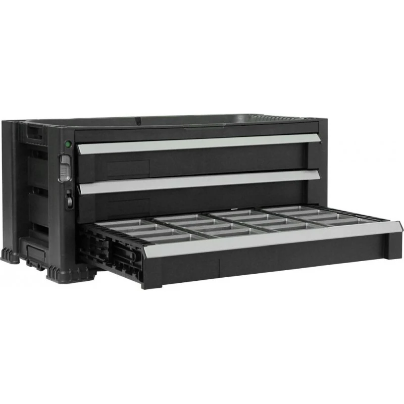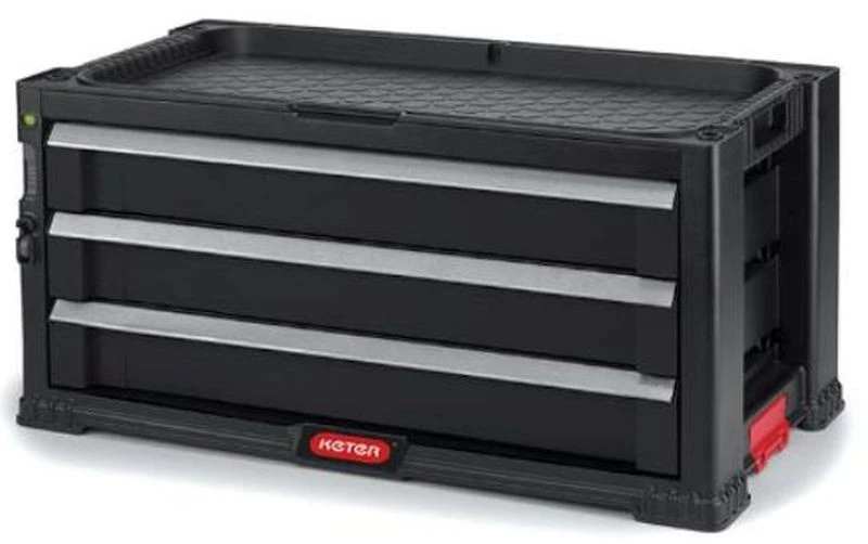 Massiver Werkzeugkasten TOOL CHEST aus festem und widerstandsfähigem Kunststoff mit drei gleich großen Schubladen. Diese sind noch in kleinere Fächer unterteilt (für Verbindungsmaterial und Kleinteile). Die Box ist stapelbar und kann mit der Box 17199303 kombiniert werden. Ideal für Garagen oder Werkstätte.